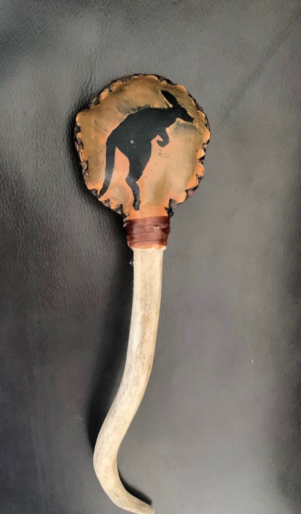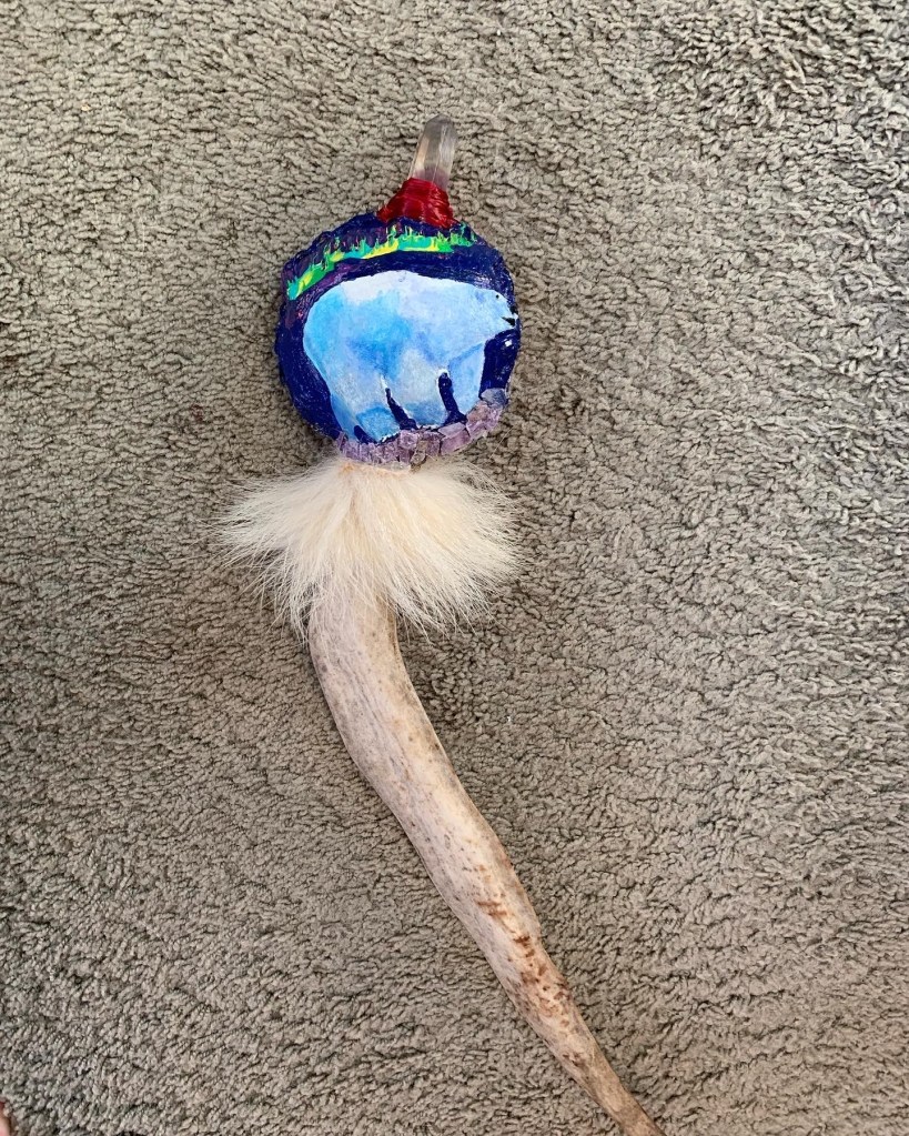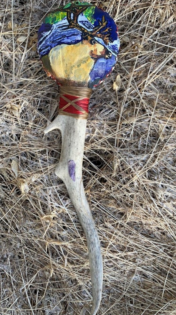This hand-painted acrylic rattle has a clear quartz crystal on top, and is mounted on a caribou antler with Charoite Stone inlay.