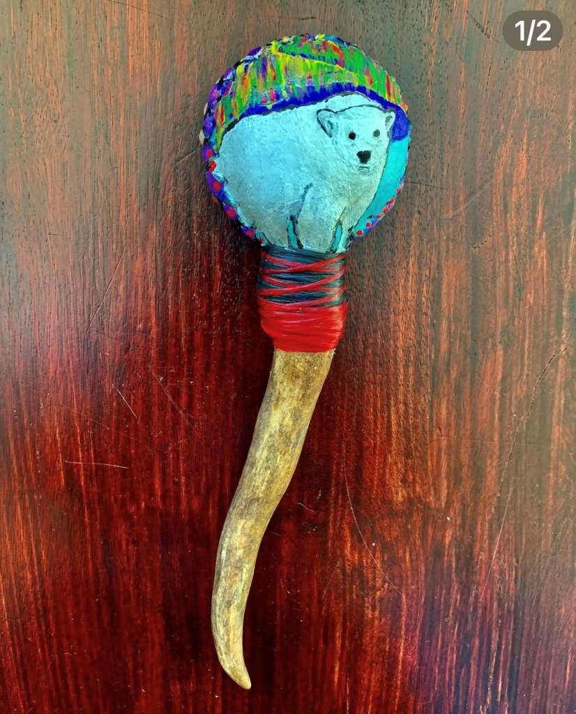 Caribou under the Aurora Borealis and Four Seasons Birch are both hand painted acrylic. Rattle is mounted on caribou antler and has a Charoite Stone inlay.