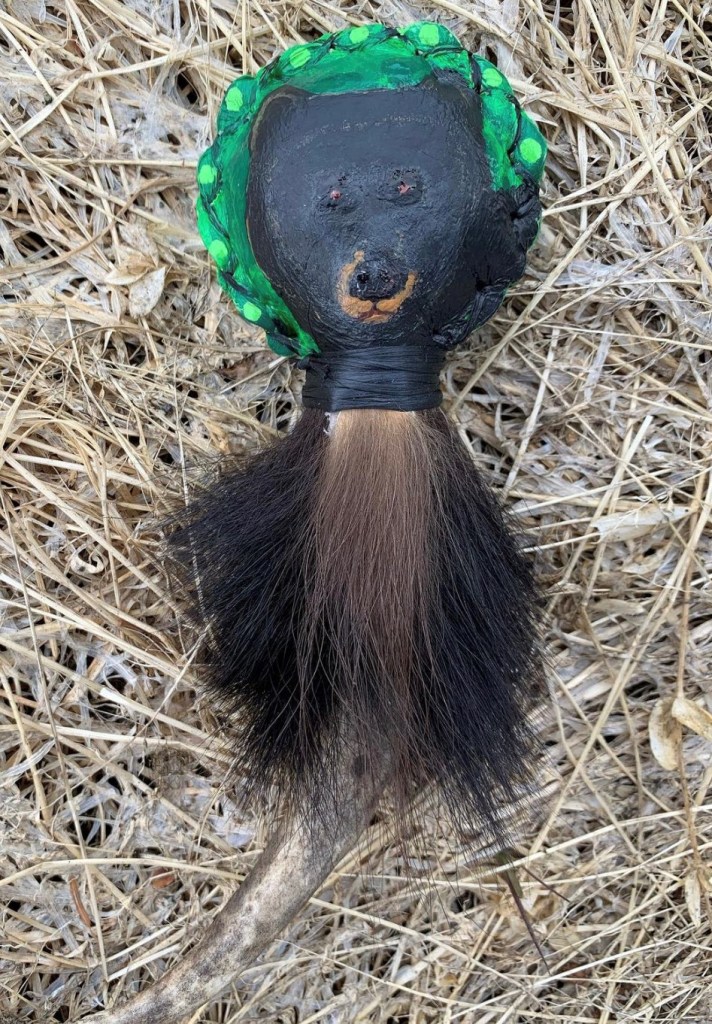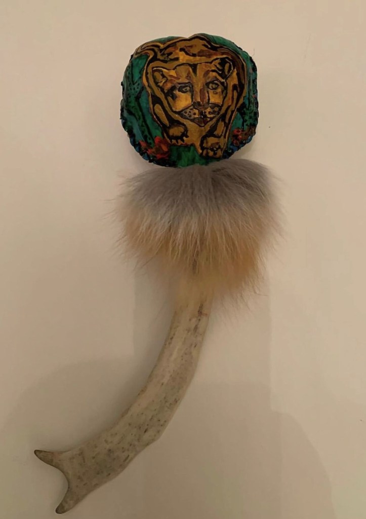 Mounted on a caribou antler, this hand-painted rattle is trimmed with black bear and grizzly bear fur ( grizzly bear fur was provided by the client : fur more information on legality of furs and permitting, please see ‘ABOUT’ page) . Black Beaufort Sea stone borders the Devil’s Club leaf. Filled with Organic coffee beans.