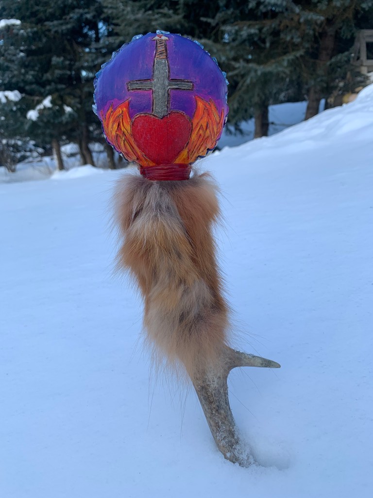 This rattle was designed for a special friend and healer in Sedona, Arizona. Michael is pyrography and acrylic. The Heart and Sword are made entirely from home-tanned salmon leather, dyed and cut to size. The hilt of the Sword has a micro-beveled heart of Bloodstone and the entire rattle is bordered with Aquamarine and Lapiz Lazuli. The rattle is mounted on a caribou antler and is trimmed with the fur of an Alaskan Red Fox foreleg.