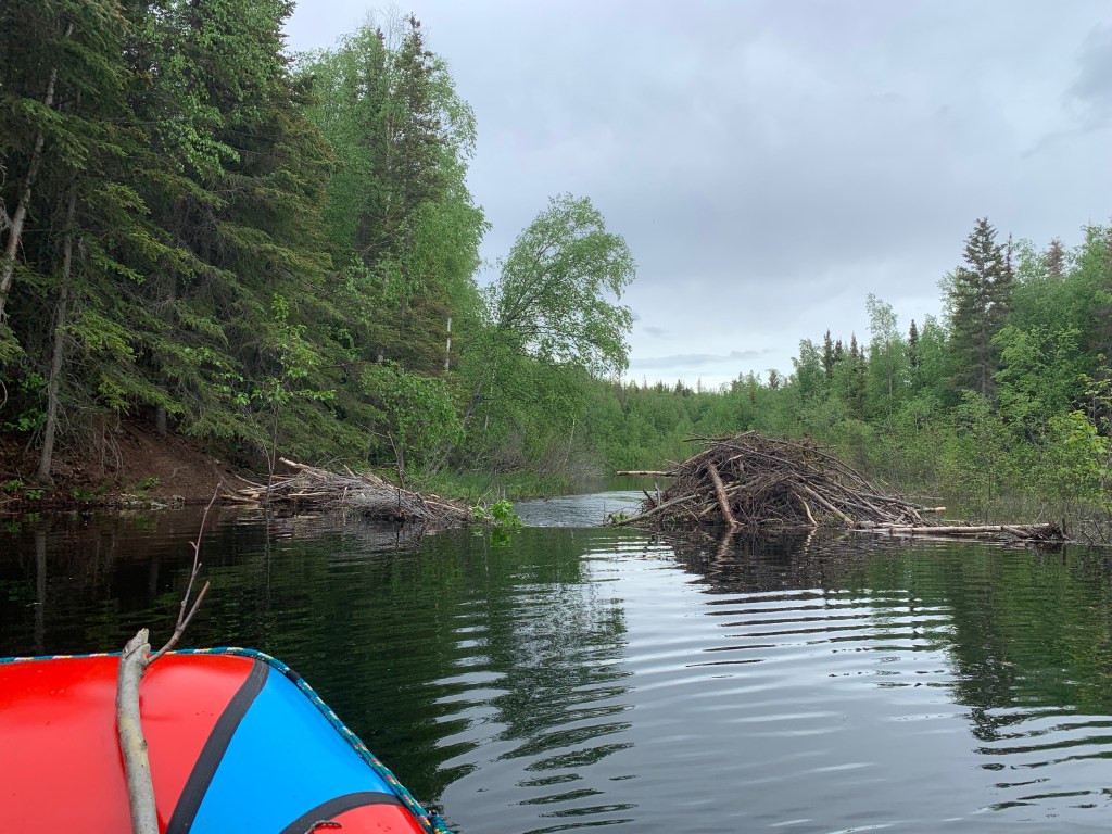 I spent a full day exploring a large lake in my pack raft, eventually paddling down stream in it until I came across a flooded forest where the beavers had dammed the stream. The beavers came out to see me, and I decided this would be a good place to harvest some natural products for the rattle.