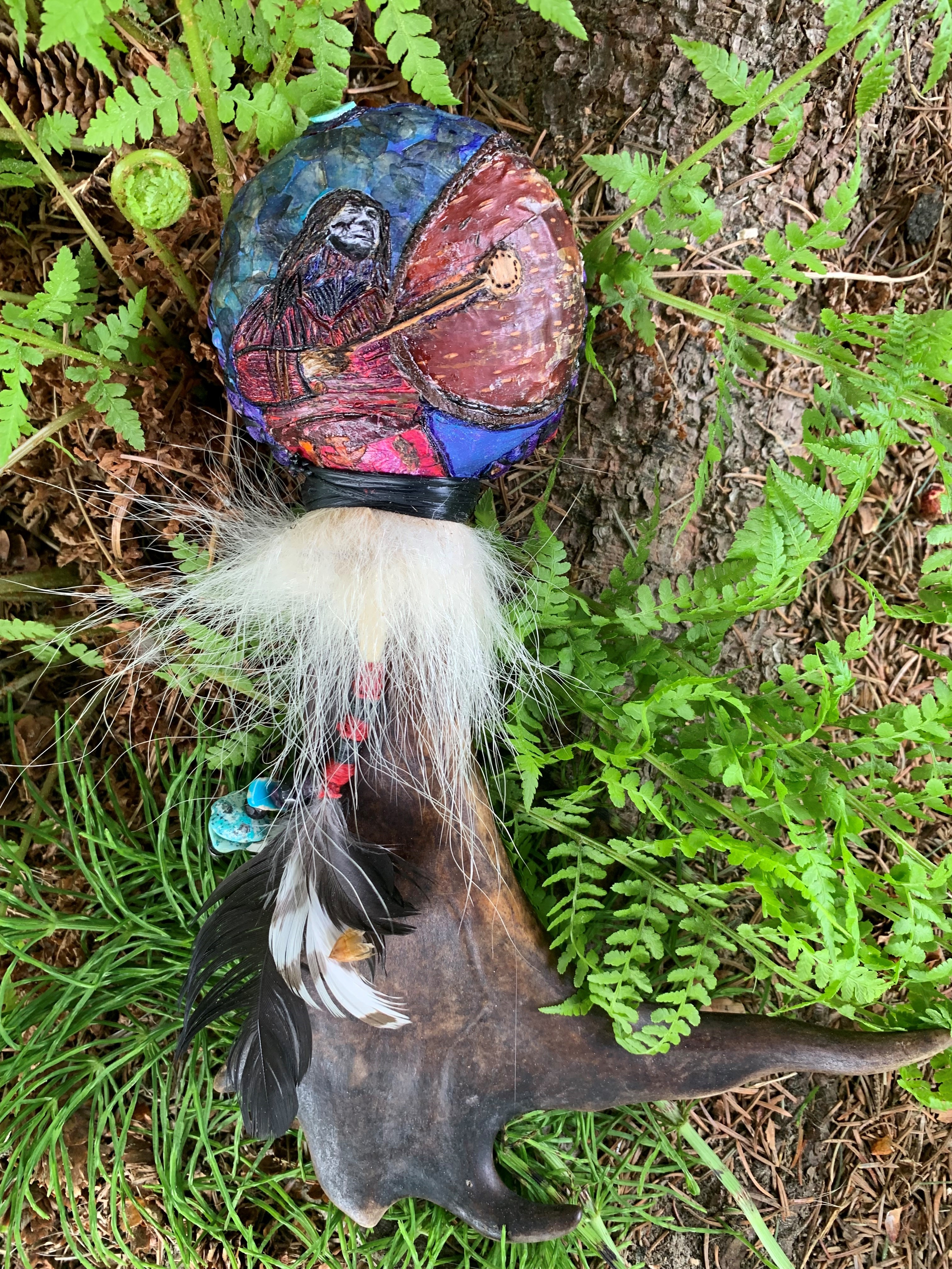 The rattle has a pyrography base and is accented with acrylic paints. It is mounted on a very unique antler tine from a Kobuk Valley caribou. It has some crystals wired to it and also some additional turquoise, located underneath the mountain goat fur.