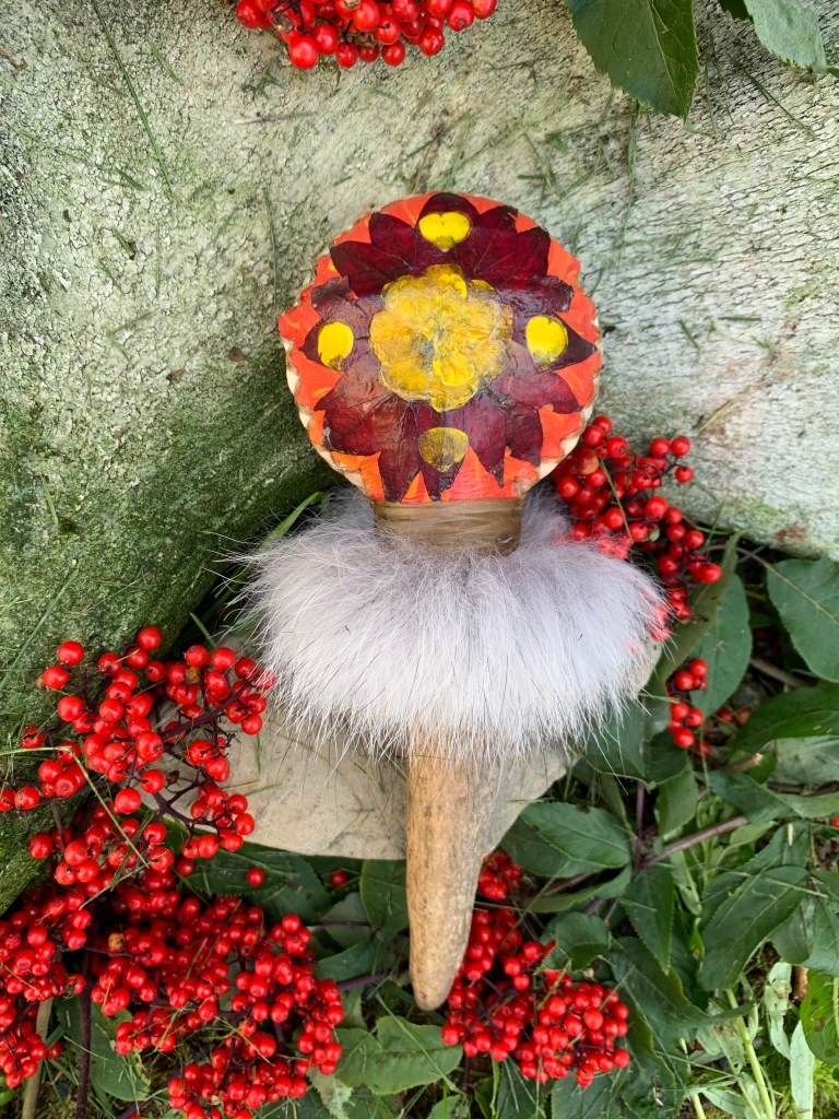 One of my best friends requested a rattle : he had a very intense and long encounter with a black wolf while he was in the wilderness. I listened intently to his story and descriptions of the wolf and landscape and set out to recreate the wolf in rattle form.